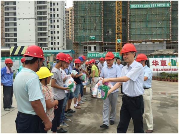 2016年7月27日上午,為切實做好建筑工地防暑降溫工作,讓施工人員在溫馨的工作環(huán)境中安全作業(yè),園區(qū)黨工委委員、管委會副主任、規(guī)劃建設局局長許紹杰、副局長張循在開發(fā)公司副總裁劉建華的陪同下冒著酷暑慰問夢家園工地一線施工人員。