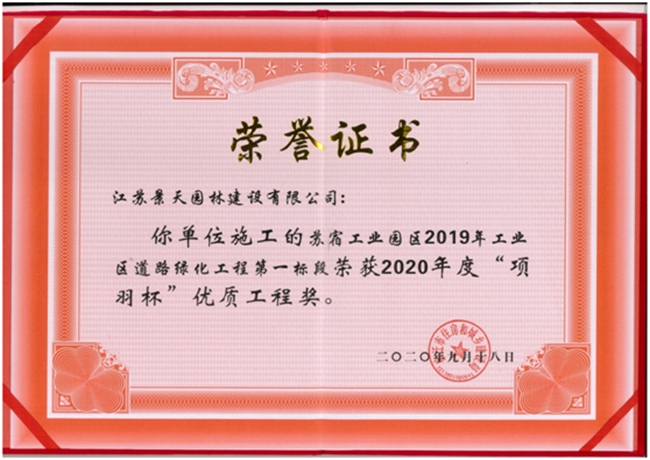 近日,由江蘇省蘇州宿遷工業(yè)園區(qū)開發(fā)有限公司建設(shè)管理的蘇宿工業(yè)園區(qū)2019年工業(yè)區(qū)道路綠化工程第一標(biāo)段榮獲2020年度“項(xiàng)羽杯”優(yōu)質(zhì)工程獎(jiǎng)。