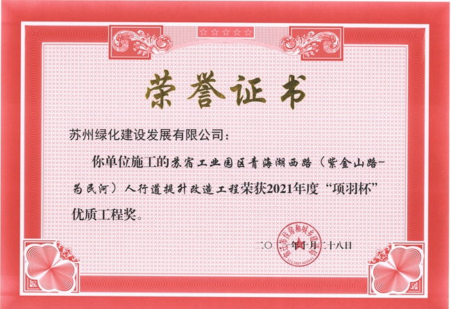 園區(qū)青海湖西路人行道提升改造工程喜獲2021年度宿遷市“項羽杯”優(yōu)質(zhì)工程獎