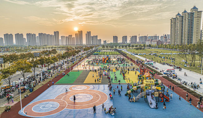 玄武湖西路北側(cè)臨時(shí)健身公園占地面積約2.2萬(wàn)平方米,內(nèi)部設(shè)置720米健身跑道、全齡段健身區(qū)、綜合兒童活動(dòng)區(qū)、平地輪滑場(chǎng)、廣場(chǎng)舞區(qū)及各類球場(chǎng)(籠式籃球場(chǎng)4組、7人制籠式足球場(chǎng)1組、羽毛球場(chǎng)4組、網(wǎng)球場(chǎng)一組)等6項(xiàng)主題運(yùn)動(dòng)功能,滿足周邊群眾“一站式”運(yùn)動(dòng)健身需求。場(chǎng)地建成后先后登上人民日?qǐng)?bào)頭版、新華日?qǐng)?bào)、學(xué)習(xí)強(qiáng)國(guó)等國(guó)家主流媒體,園區(qū)充分利用閑置待開發(fā)地塊空間,積極構(gòu)建“10分鐘健身圈”,獲得周邊居民的認(rèn)可和喜愛。